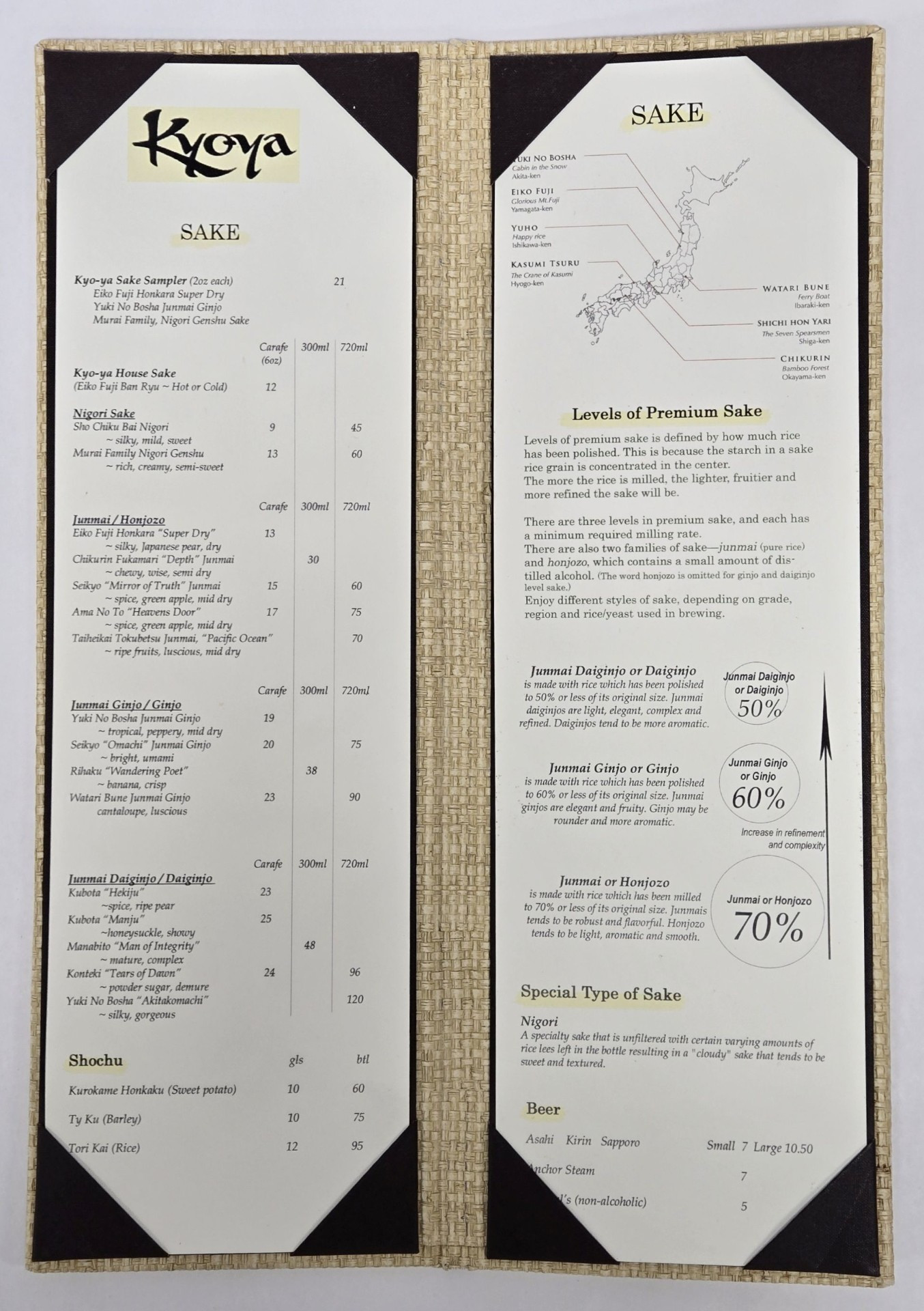 A 1990s Kyoya menu from when the restaurant was briefly in the Palace Hotel. I found and photographed this when I was in the Palace Hotel archives.