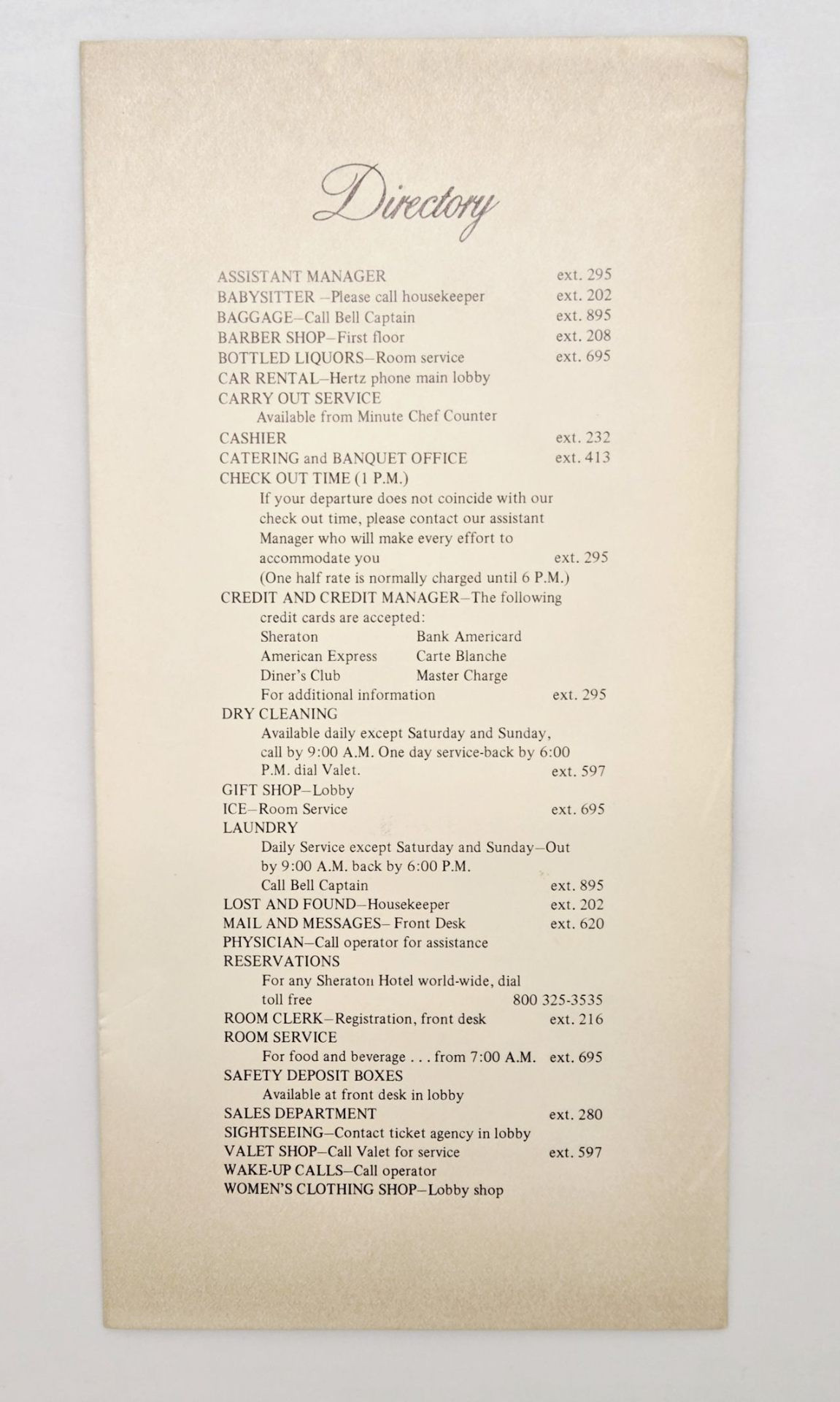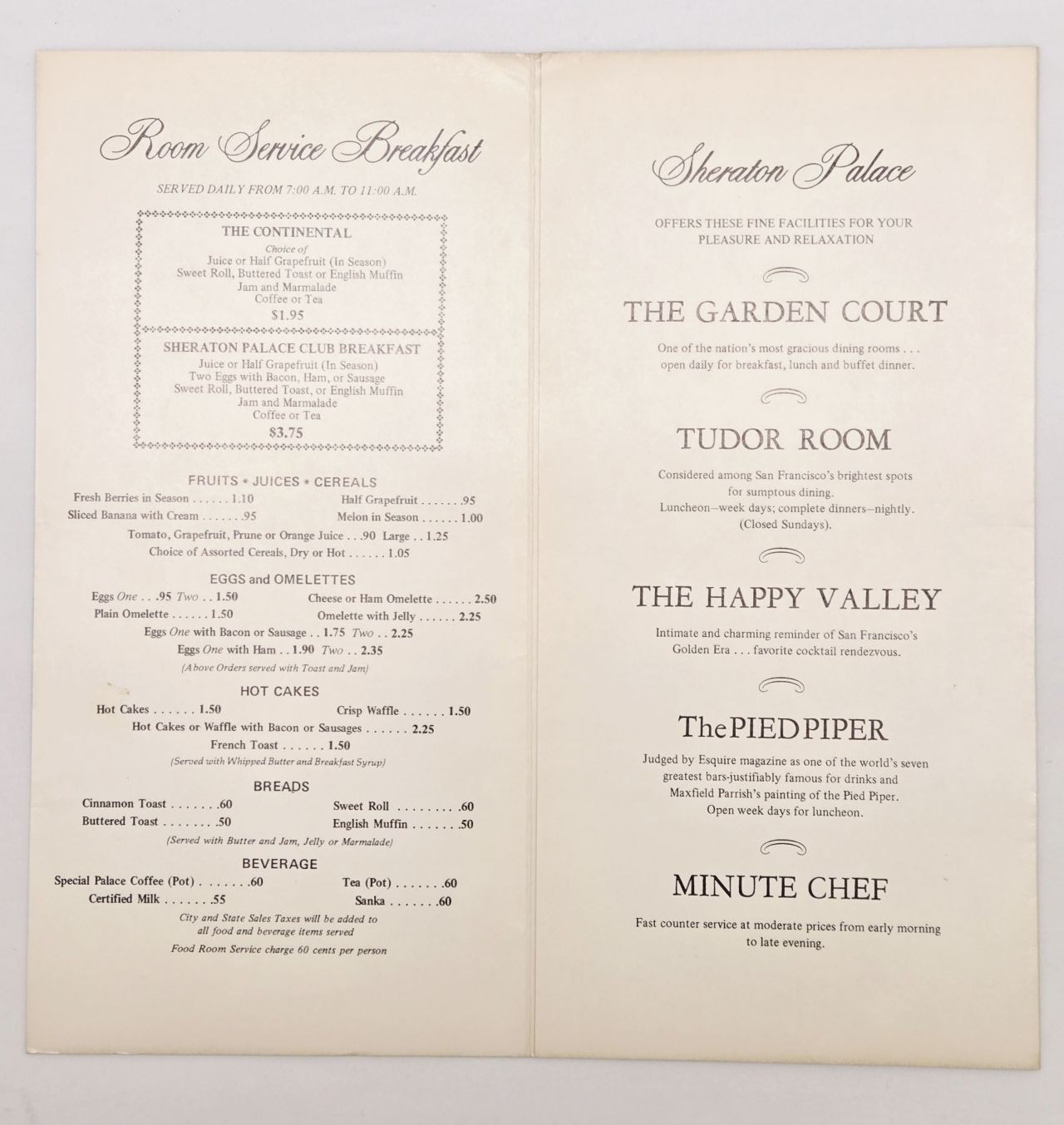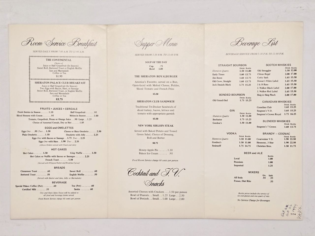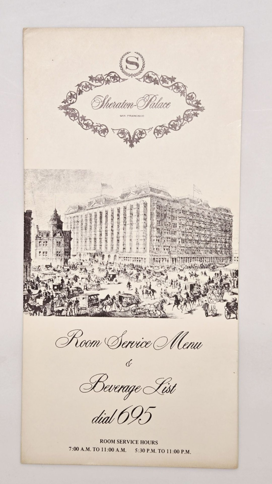 Room Service Menu & Beverage List for the Sheraton-Palace. Someone dated it October 26th, 1974.