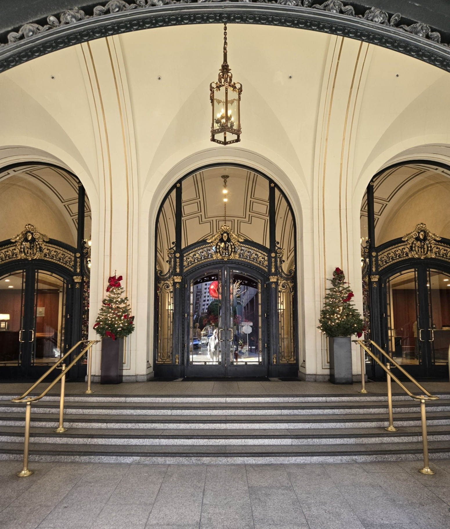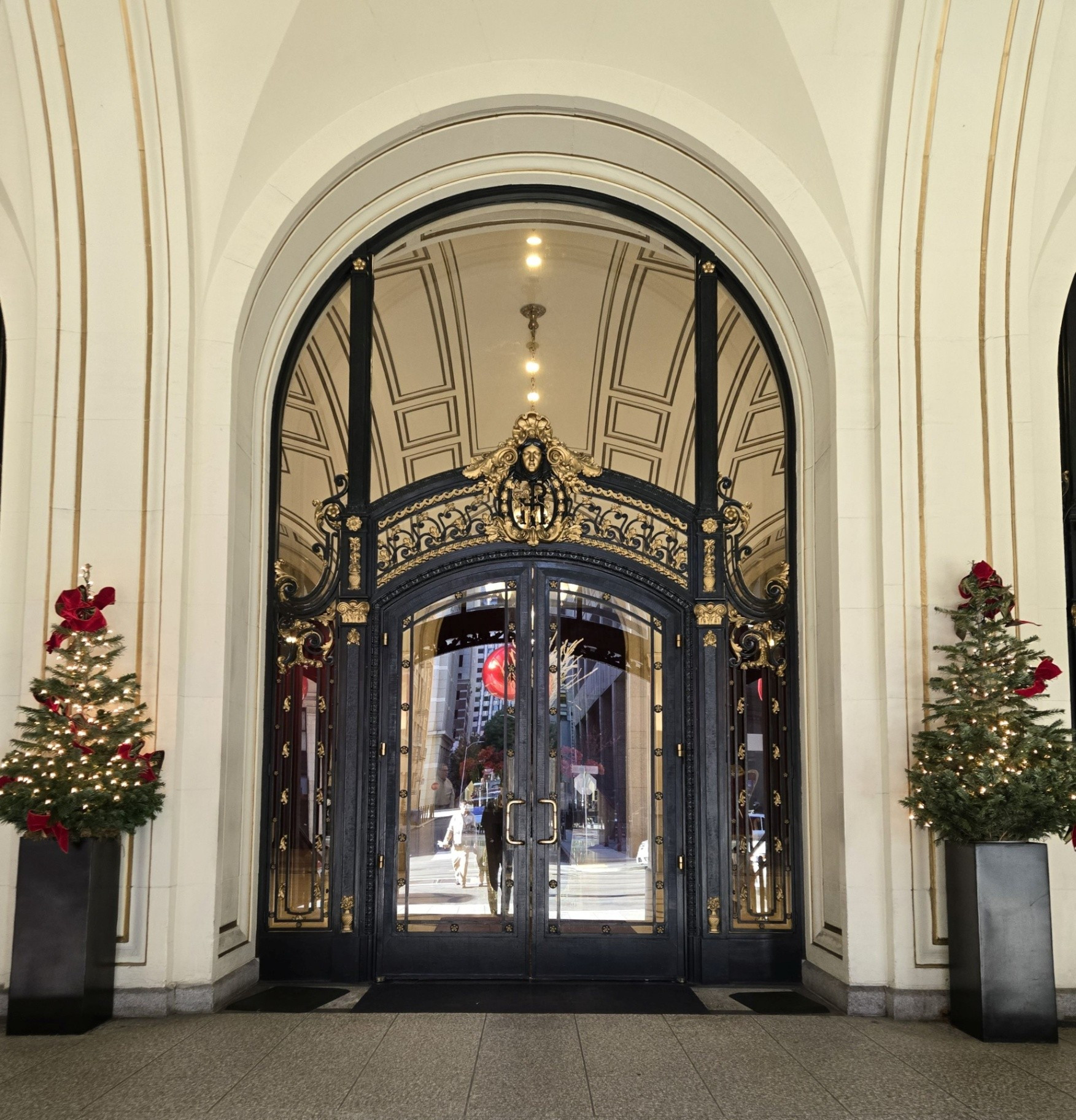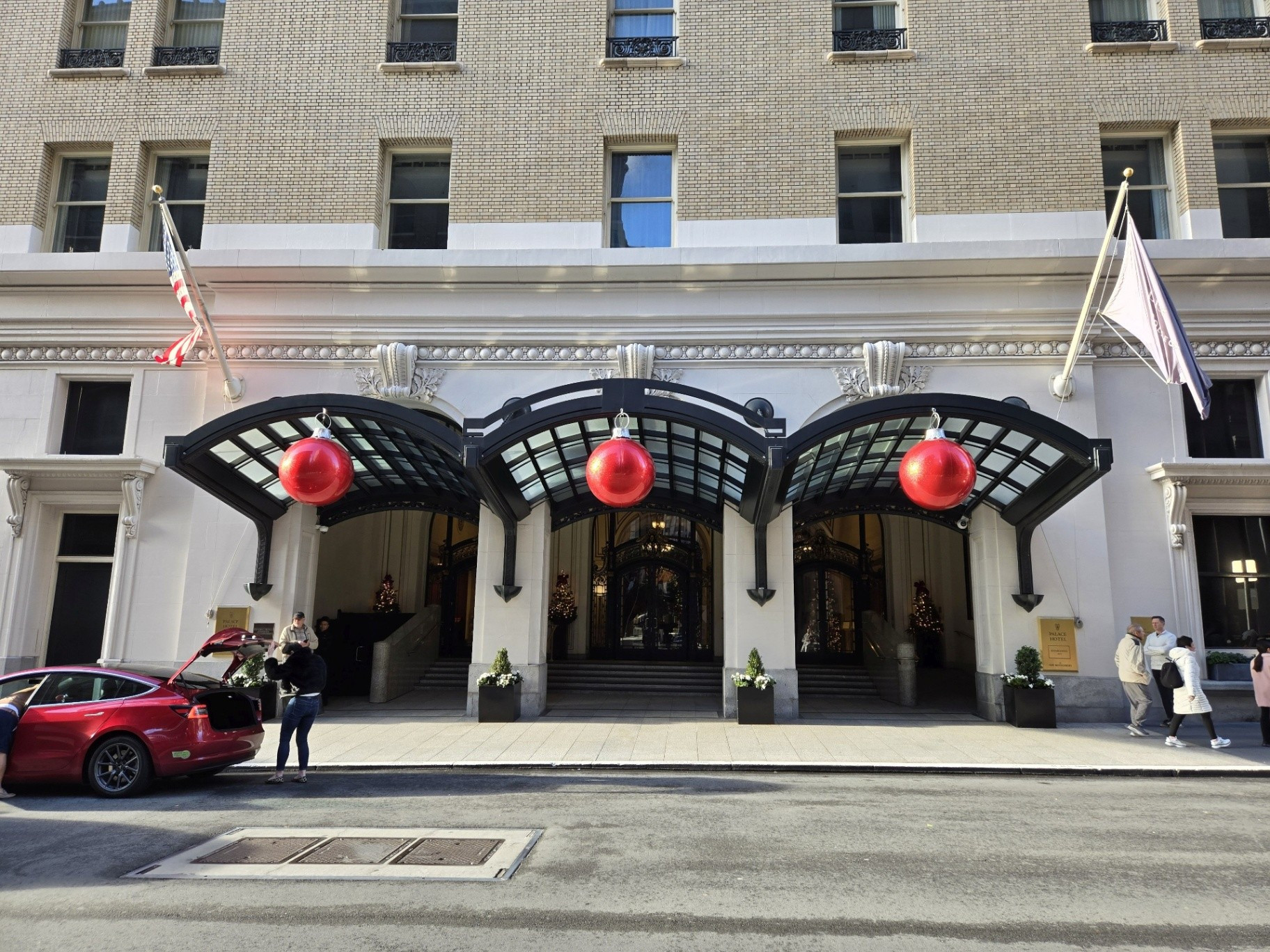 December 23, 2025. After spending a relaxing three days in San Diego, our driver pulled up to the entrance of the Palace Hotel at approximately 1:30 in the afternoon. A sense of giddiness welled up inside me as the doorman drew back the ornate lobby doors, and we were immediately enveloped by a dazzling display of holiday decorations accompanied by Christmas music. This was no ordinary visit to the Palace, but rather the culmination of two years of focused research and six years of dedicated collecting, all leading to the writing of my final chapter commemorating the hotel’s 150th anniversary. Portions of the exterior were shrouded in tarps and scaffolding, a necessary undertaking to address areas of stonework that had weakened with time. Even so, the Palace remained as beautiful as ever.
