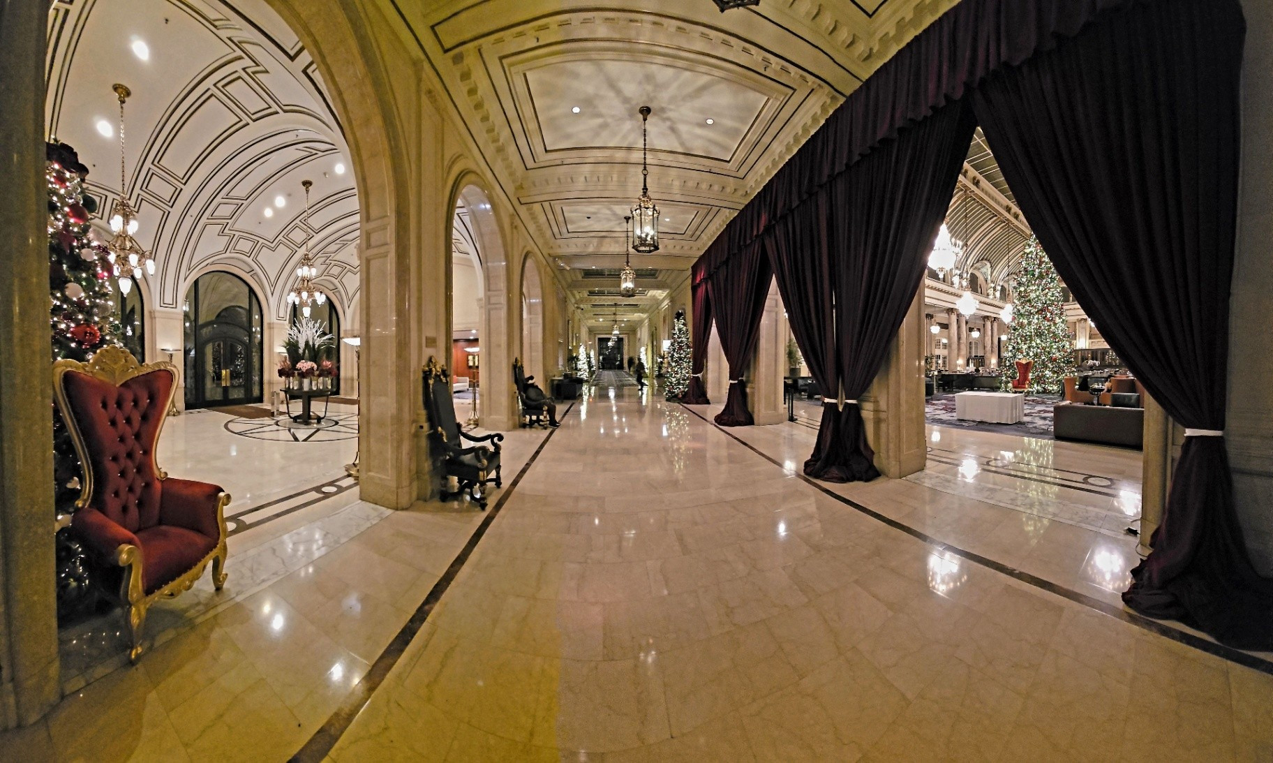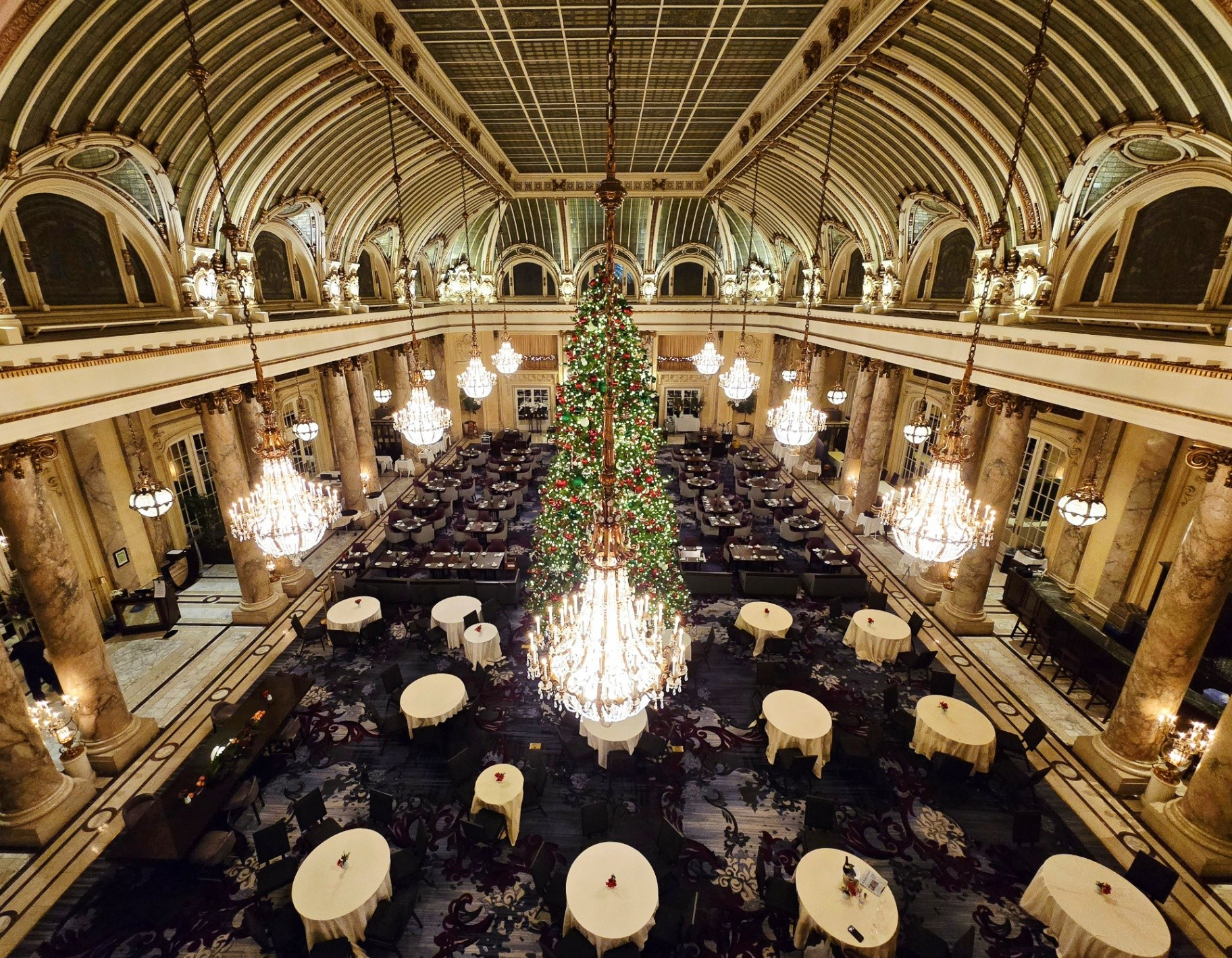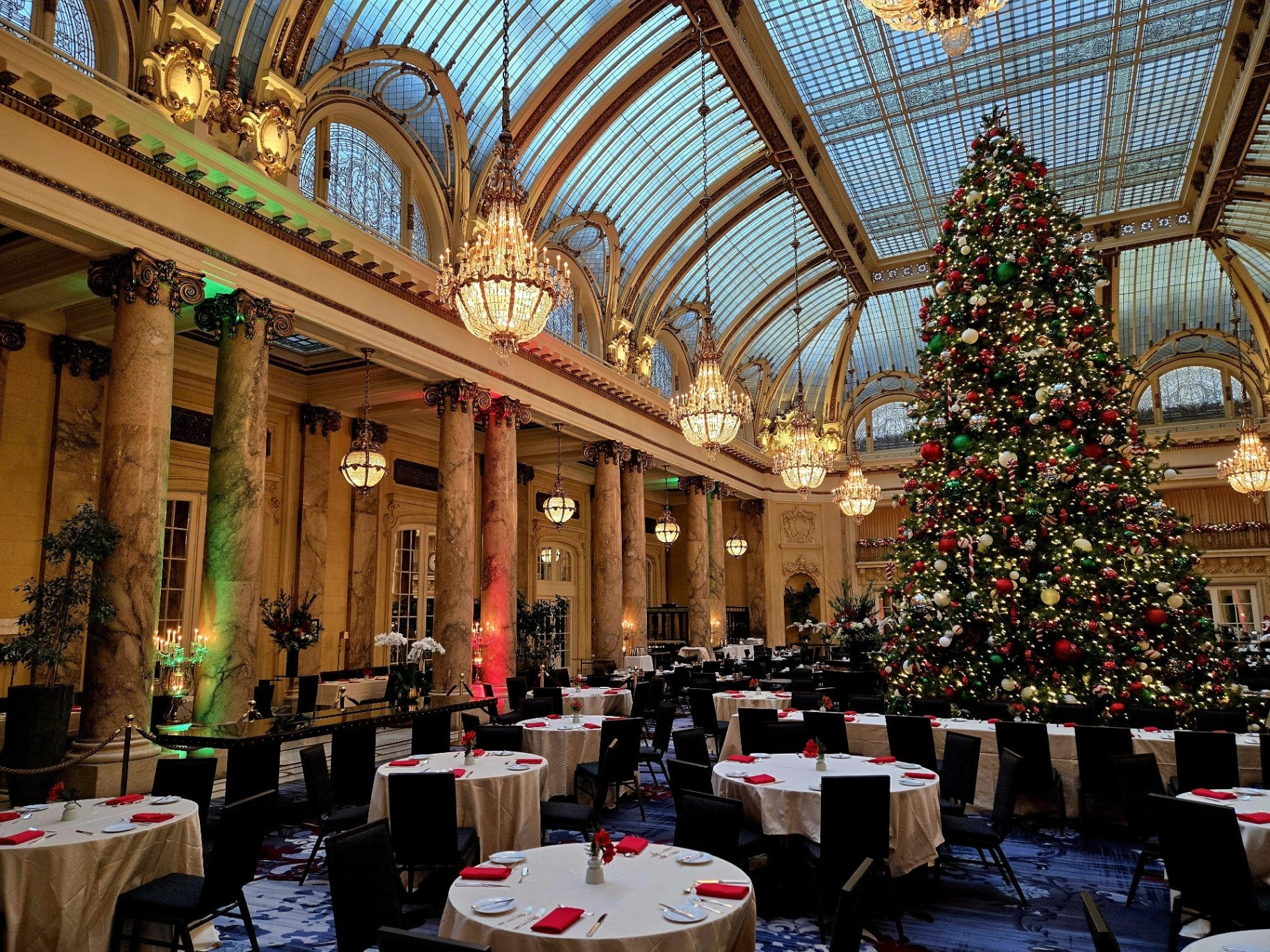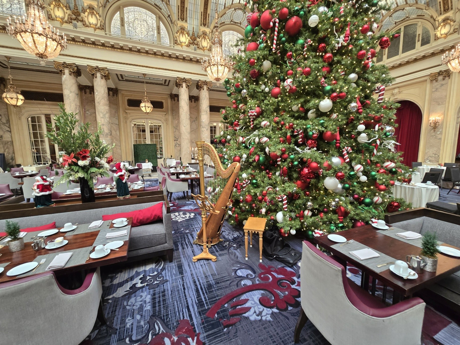 *During this visit, I photographed the lobby, main corridor, and Garden Court extensively. Owing to the numerous holiday events and weddings taking place, several spaces - including the Gold Ballroom, Rose Room, Ralston Room, and French Parlor - were in various stages of setup or breakdown, making them unsuitable for updated photography. The Pied Piper proved particularly challenging to photograph due to the constant flow of guests, as it remained one of the most popular dining venues throughout our stay.
