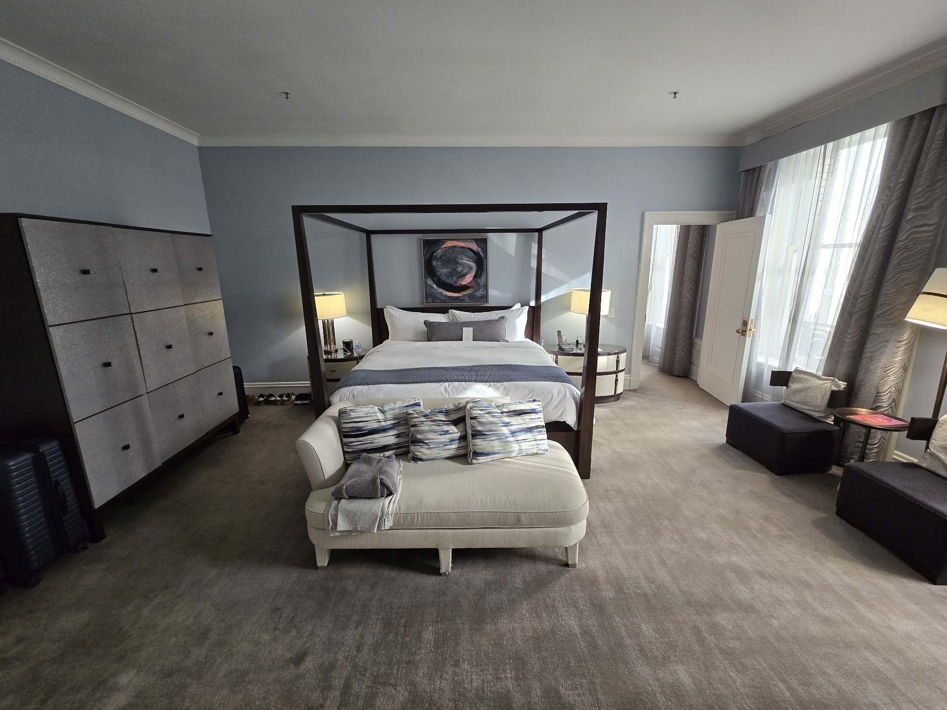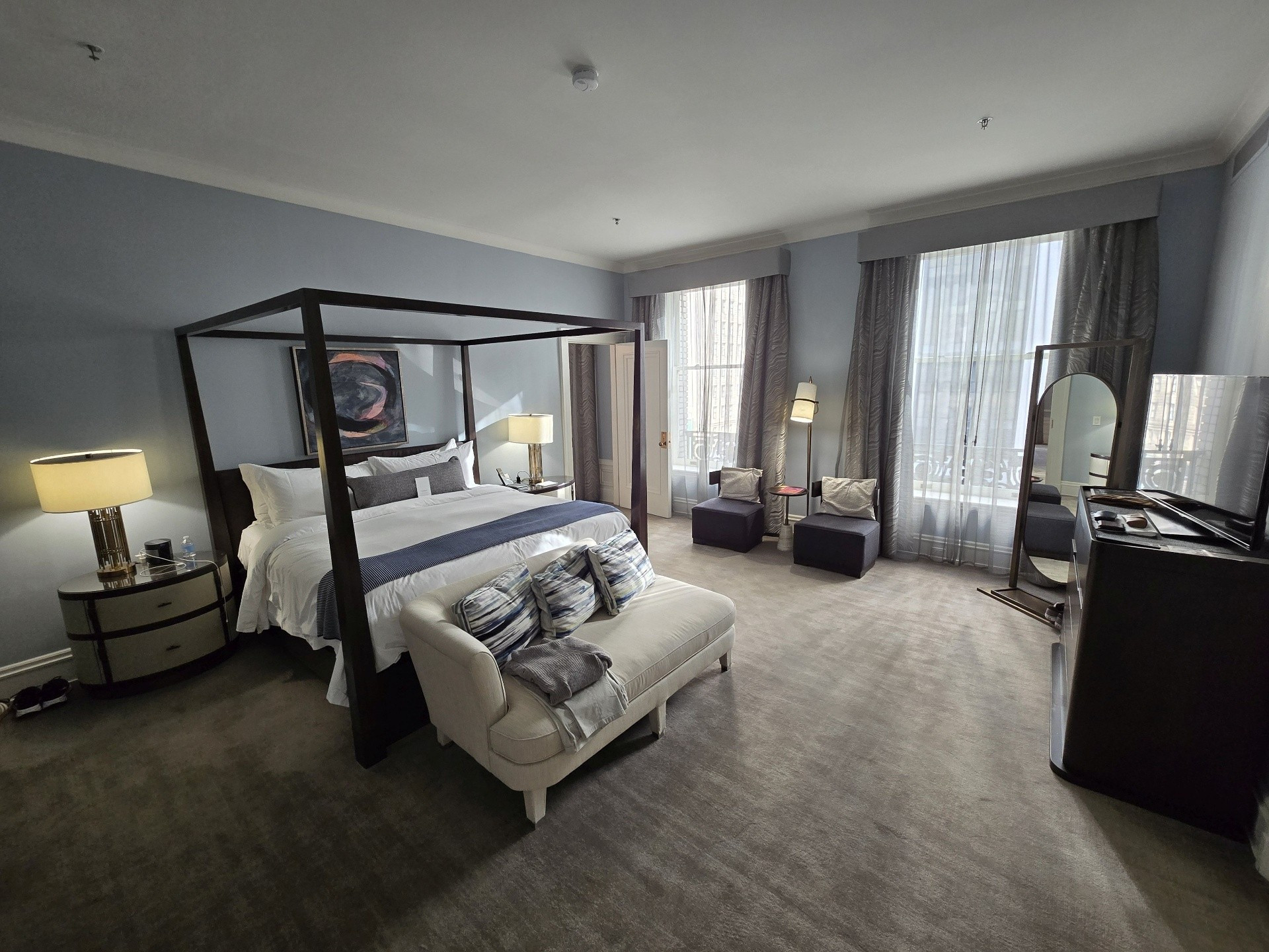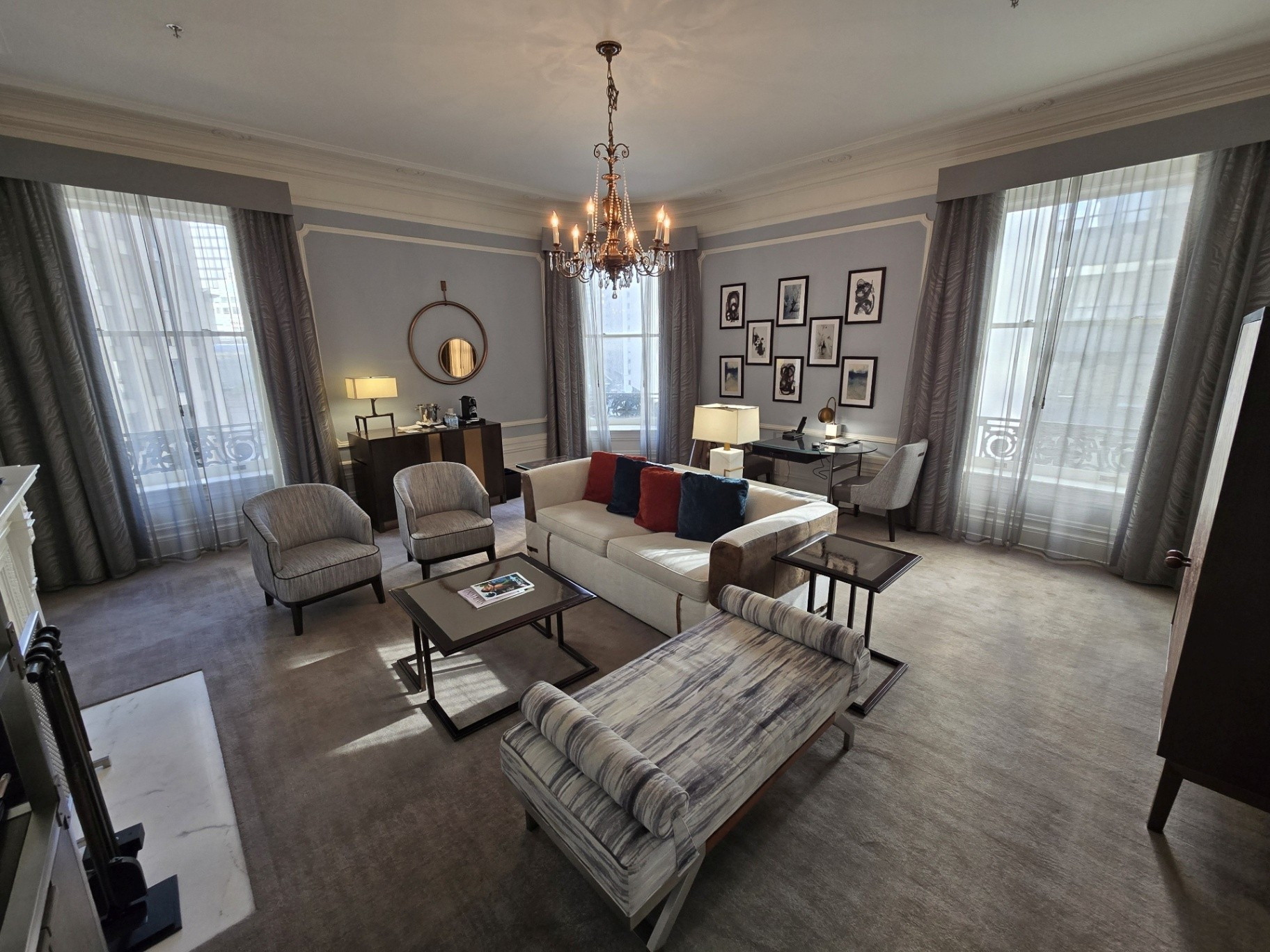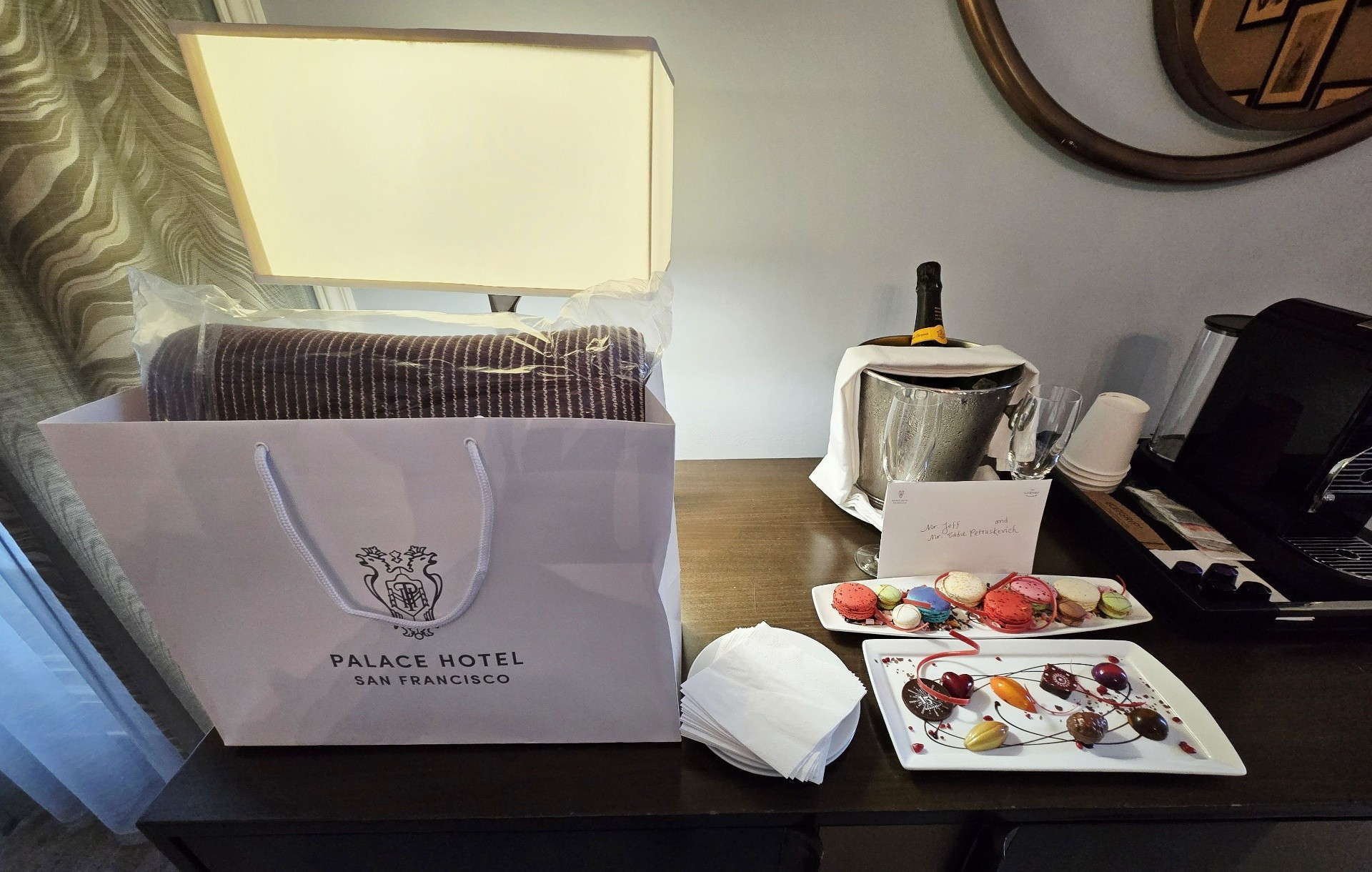 If was ever a trip on which to splurge, this was it. We chose to book one of the Palace Suites, Room #538, overlooking Market and New Montgomery Streets on the 5th floor. Originally, we were booked into Room #288, a slightly larger Palace Suite once called the Bridal Suite. However, it was on the corner of Annie and Market Streets - the side of the building covered in scaffolding and tarps. Not wanting blocked views, I opted to wait for one on the New Montgomery Street side. At nearly 900 square feet, the suite featured a gracious living room complete with a fireplace and original 1909 crystal chandelier, a large bedroom anchored by a four-post bed, and a master bathroom with a soaking tub and expansive shower. Throughout, timeless elegance was seamlessly balanced with sleek modernity. The Toto Washlet remains one of my favorite luxury touches in these rooms. We later learned from staff that this was the same suite once occupied by Ruth Bader Ginsburg, who reportedly ordered oatmeal each morning and worked at the glass table during her stay. Additional surprises awaited us on the side counter: a new king-size decorative blanket bearing the PH logo (a purchase my husband arranged in advance), chocolates from Christopher Elbow, macarons, a bottle of Veuve Clicquot, and a personalized welcome card and note. I was also pleased to see that the toiletries had reverted to Le Chemin since our last visit, though the familiar small take-home bottles had been replaced with larger, refillable versions intended to remain in the room.