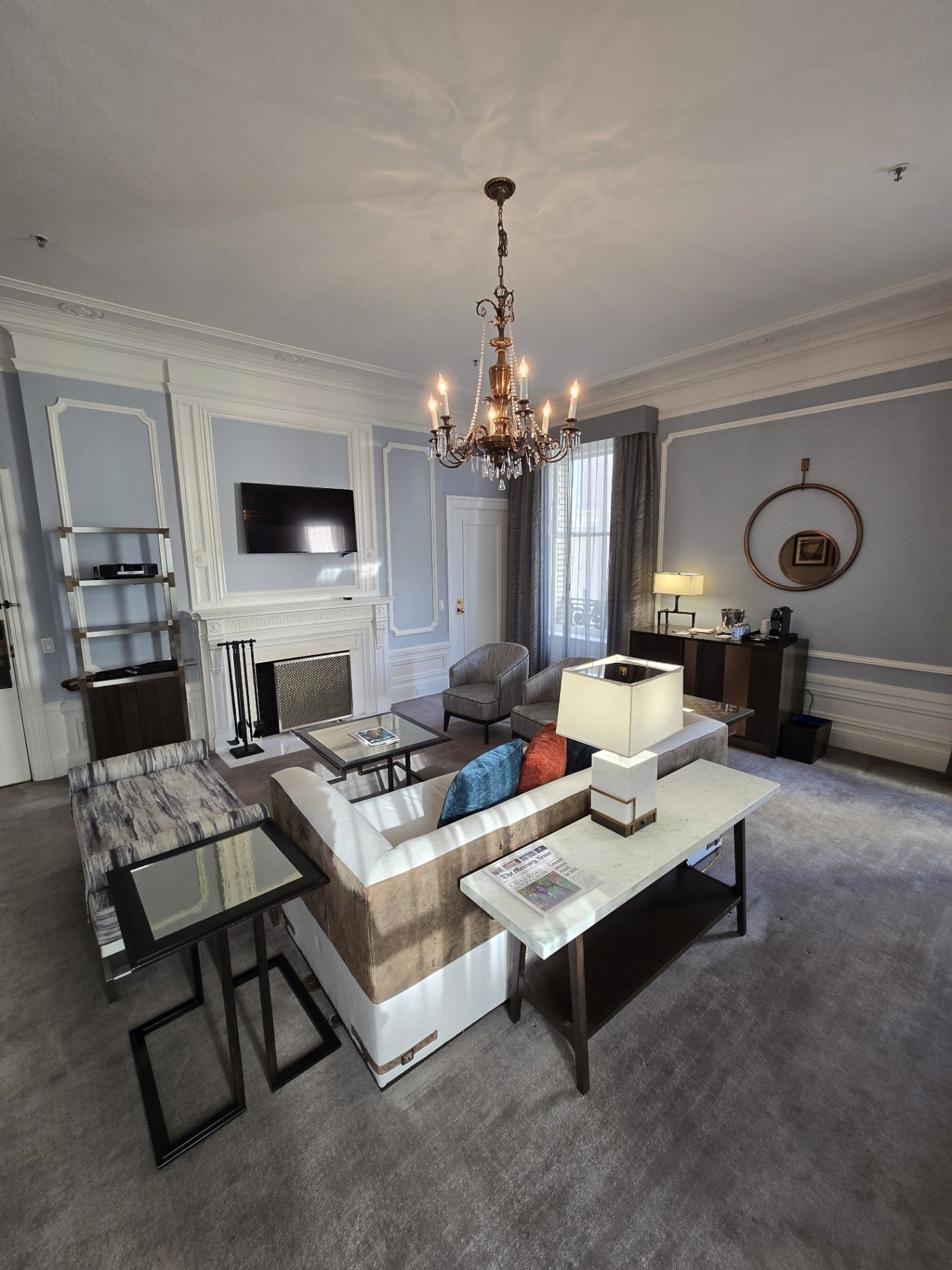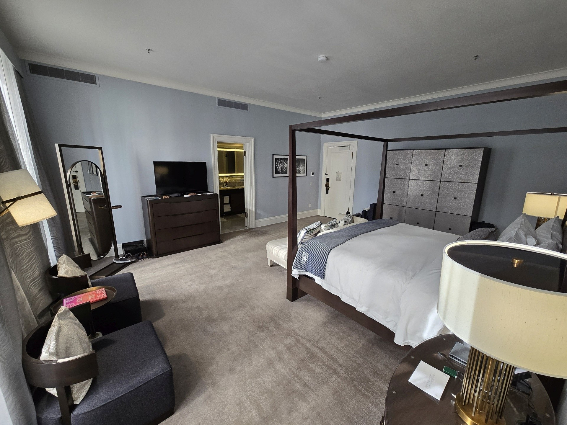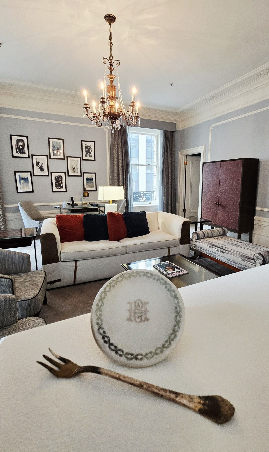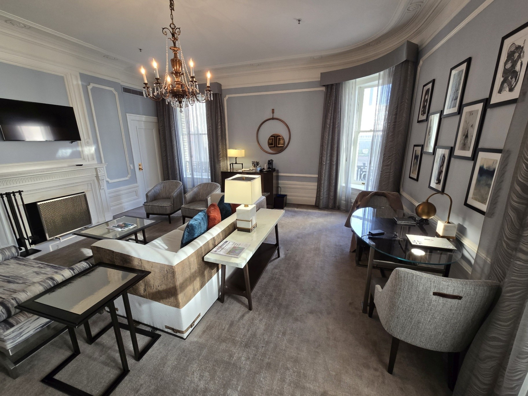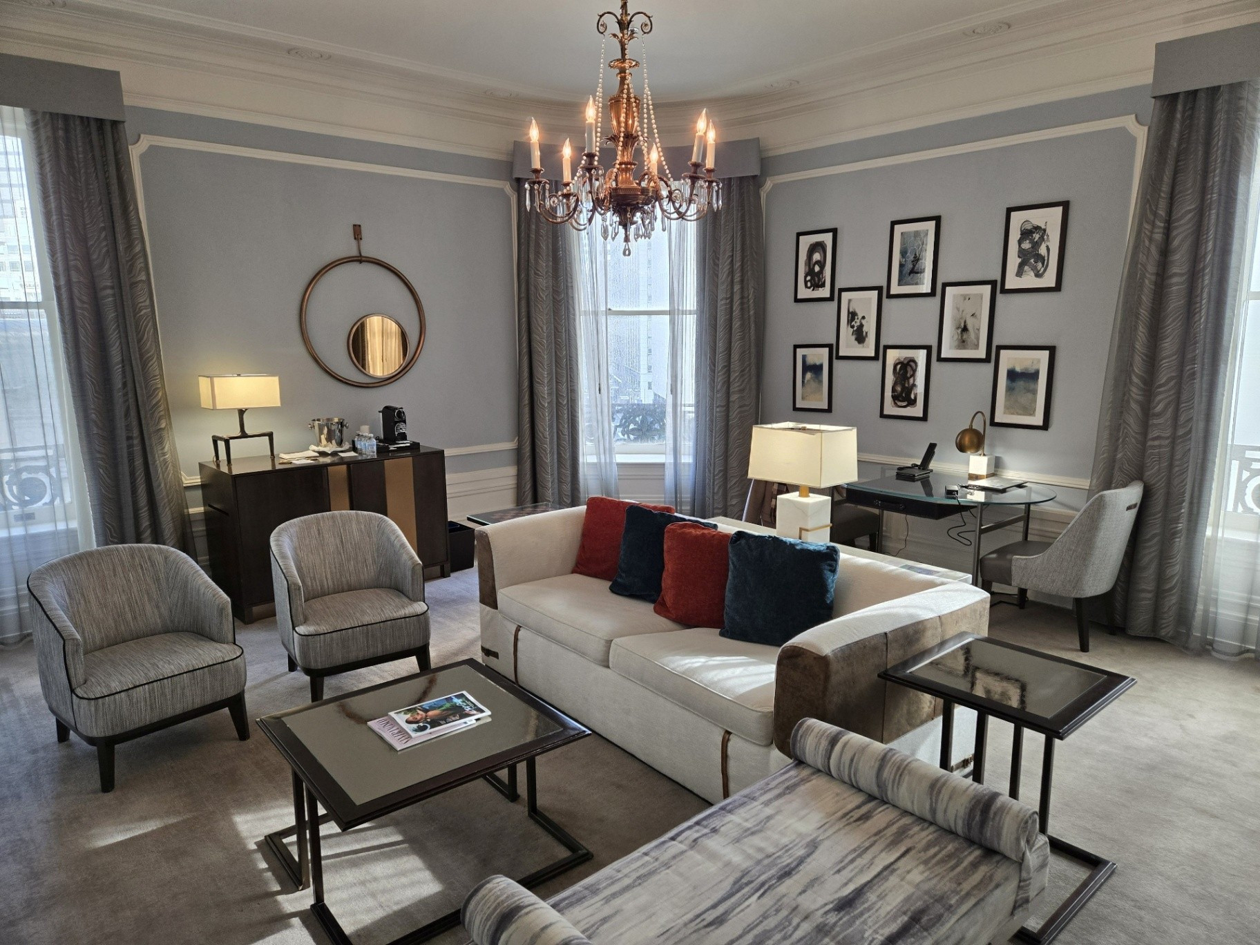 If was ever a trip on which to splurge, this was it. We chose to book one of the Palace Suites, Room #538, overlooking Market and New Montgomery Streets on the 5th floor. Originally, we were booked into Room #288, a slightly larger Palace Suite once called the Bridal Suite. However, it was on the corner of Annie and Market Streets - the side of the building covered in scaffolding and tarps. Not wanting blocked views, I opted to wait for one on the New Montgomery Street side. At nearly 900 square feet, the suite featured a gracious living room complete with a fireplace and original 1909 crystal chandelier, a large bedroom anchored by a four-post bed, and a master bathroom with a soaking tub and expansive shower. Throughout, timeless elegance was seamlessly balanced with sleek modernity. The Toto Washlet remains one of my favorite luxury touches in these rooms. We later learned from staff that this was the same suite once occupied by Ruth Bader Ginsburg, who reportedly ordered oatmeal each morning and worked at the glass table during her stay. Additional surprises awaited us on the side counter: a new king-size decorative blanket bearing the PH logo (a purchase my husband arranged in advance), chocolates from Christopher Elbow, macarons, a bottle of Veuve Clicquot, and a personalized welcome card and note. I was also pleased to see that the toiletries had reverted to Le Chemin since our last visit, though the familiar small take-home bottles had been replaced with larger, refillable versions intended to remain in the room.