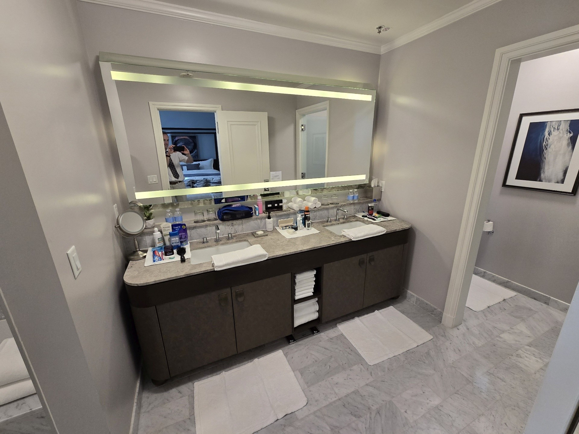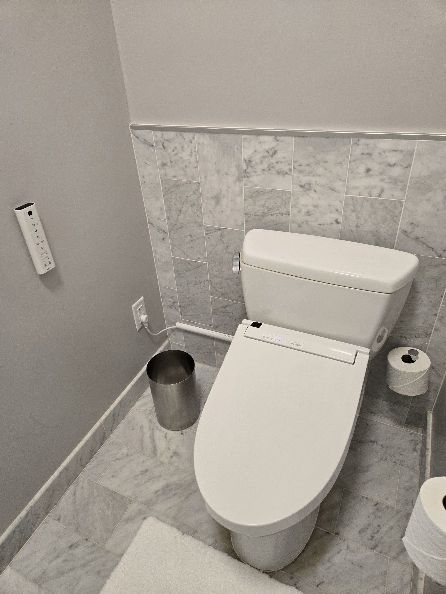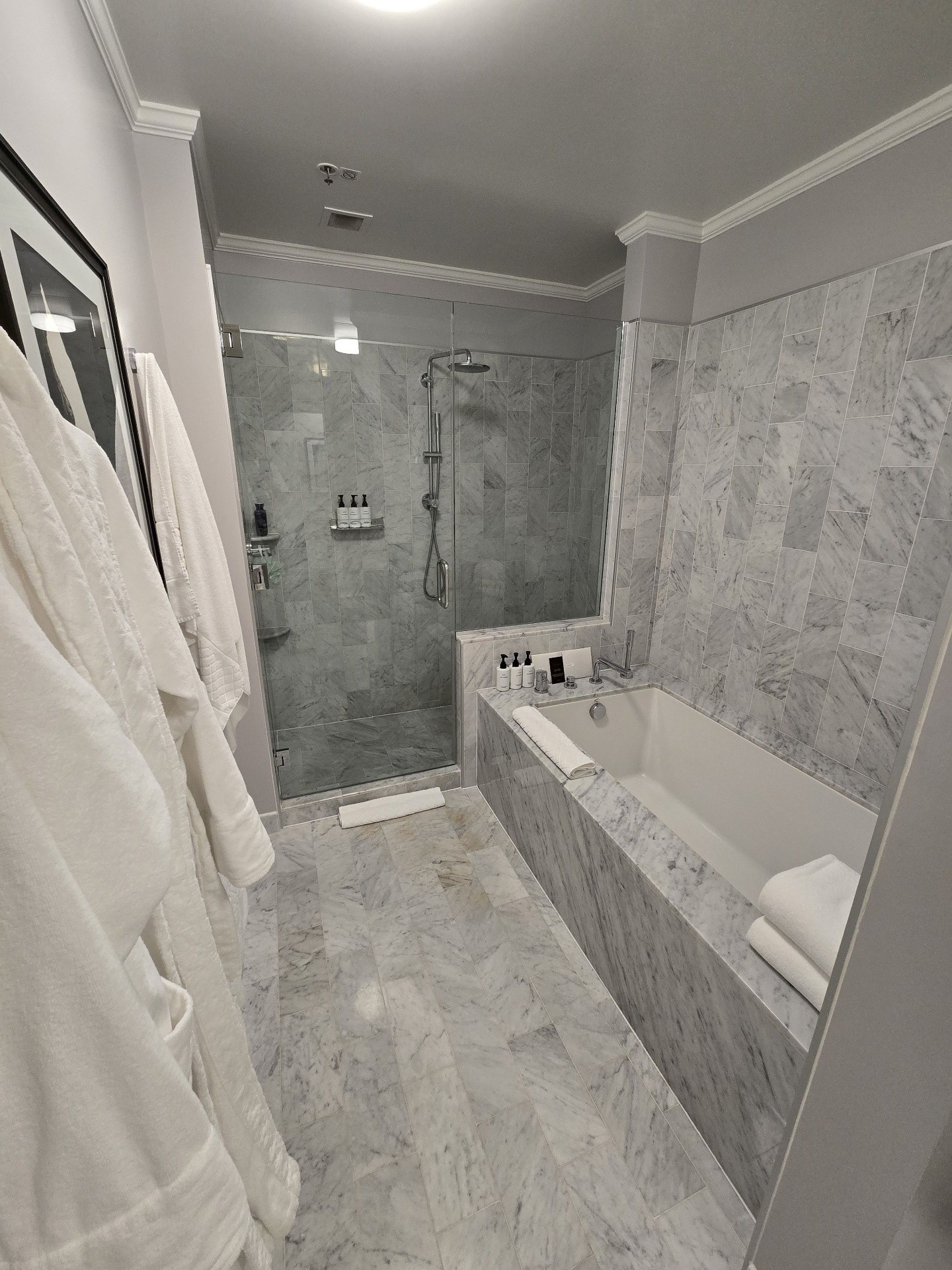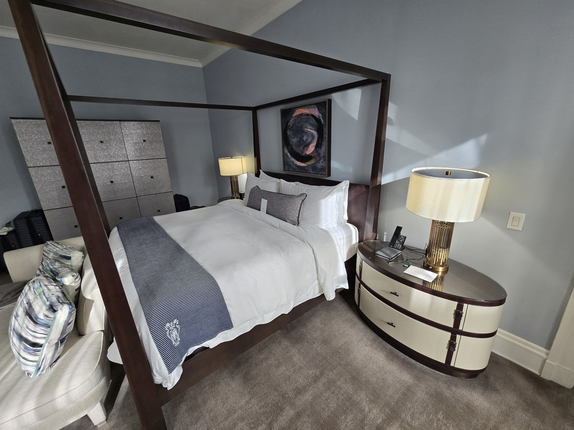 If was ever a trip on which to splurge, this was it. We chose to book one of the Palace Suites, Room #538, overlooking Market and New Montgomery Streets on the 5th floor. Originally, we were booked into Room #288, a slightly larger Palace Suite once called the Bridal Suite. However, it was on the corner of Annie and Market Streets - the side of the building covered in scaffolding and tarps. Not wanting blocked views, I opted to wait for one on the New Montgomery Street side. At nearly 900 square feet, the suite featured a gracious living room complete with a fireplace and original 1909 crystal chandelier, a large bedroom anchored by a four-post bed, and a master bathroom with a soaking tub and expansive shower. Throughout, timeless elegance was seamlessly balanced with sleek modernity. The Toto Washlet remains one of my favorite luxury touches in these rooms. We later learned from staff that this was the same suite once occupied by Ruth Bader Ginsburg, who reportedly ordered oatmeal each morning and worked at the glass table during her stay. Additional surprises awaited us on the side counter: a new king-size decorative blanket bearing the PH logo (a purchase my husband arranged in advance), chocolates from Christopher Elbow, macarons, a bottle of Veuve Clicquot, and a personalized welcome card and note. I was also pleased to see that the toiletries had reverted to Le Chemin since our last visit, though the familiar small take-home bottles had been replaced with larger, refillable versions intended to remain in the room.