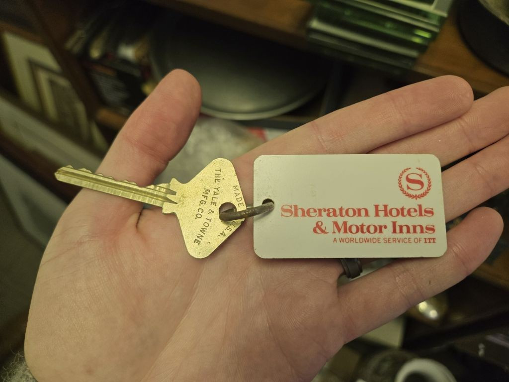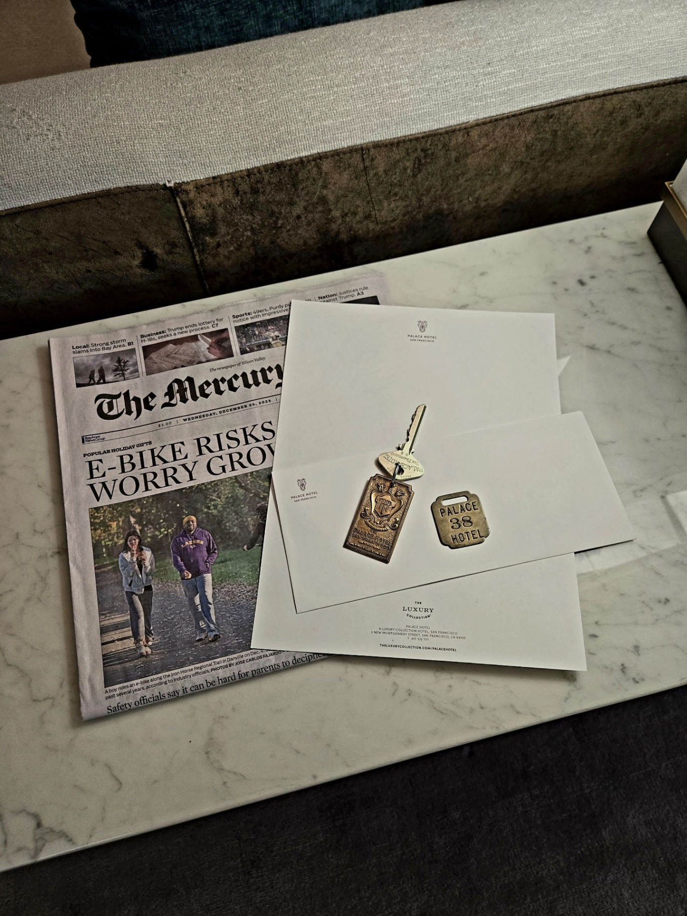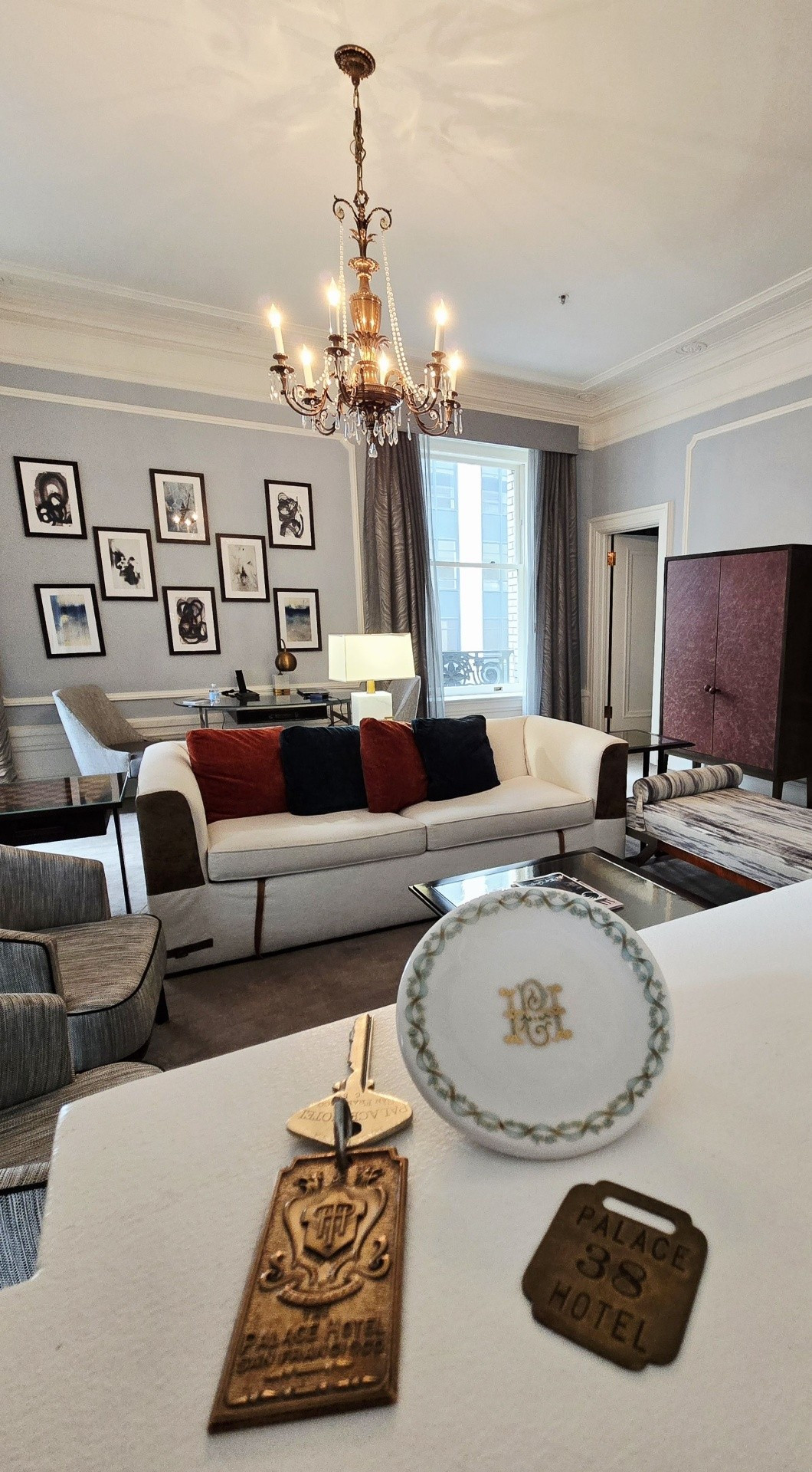 Several images during this trip feature original Palace Hotel items from my collection that I brought to photograph at the hotel. These include a 1927 gold service dinner plate, a 1930s Palace Hotel brochure, John Williams' 1919 key and fob, a 1930s room key and fob for Room 4045, and a pin tray commemorating the 1909 reopening which I donated to Mr. Clark for the hotel collection since I had 3 of them.