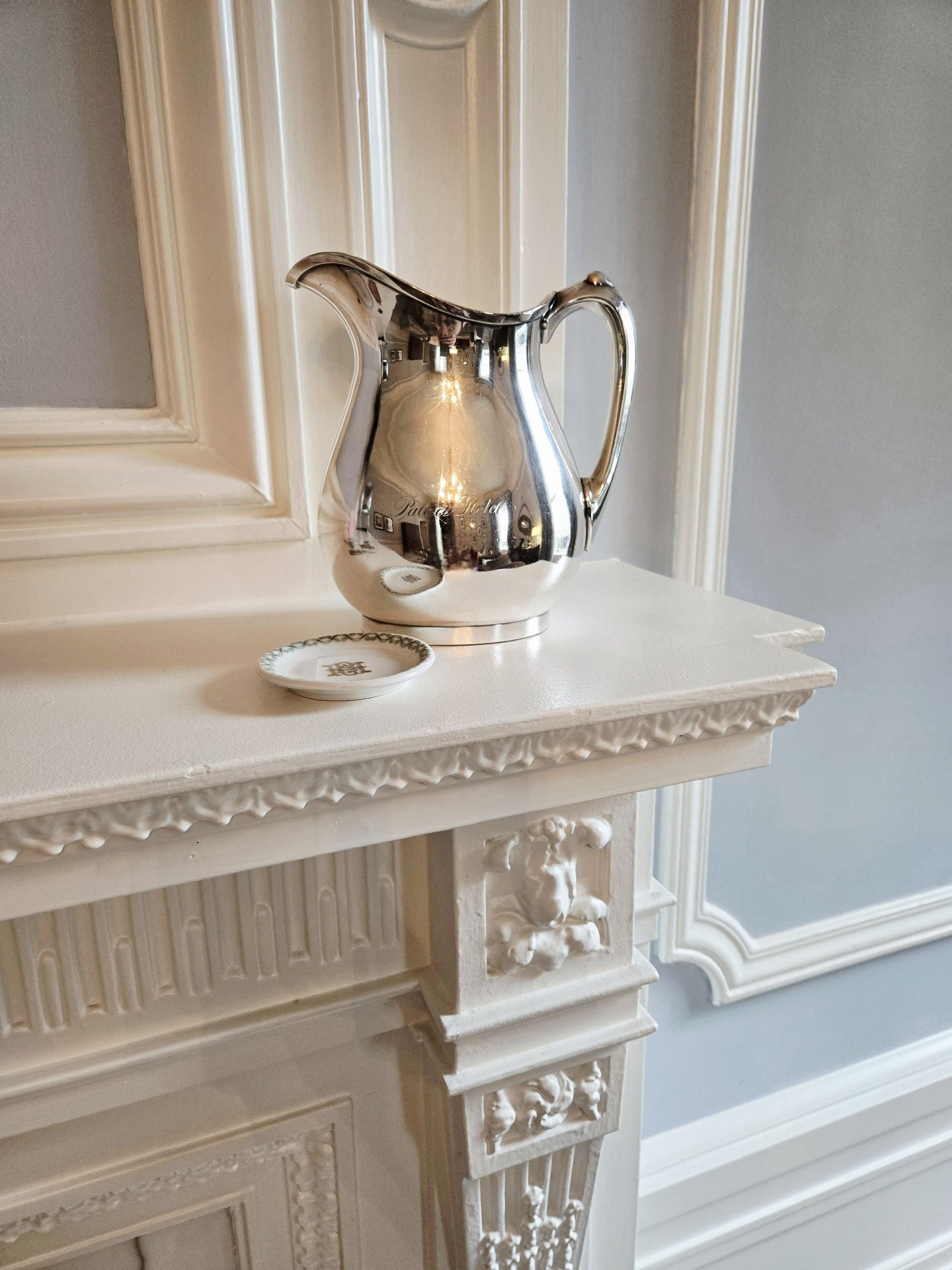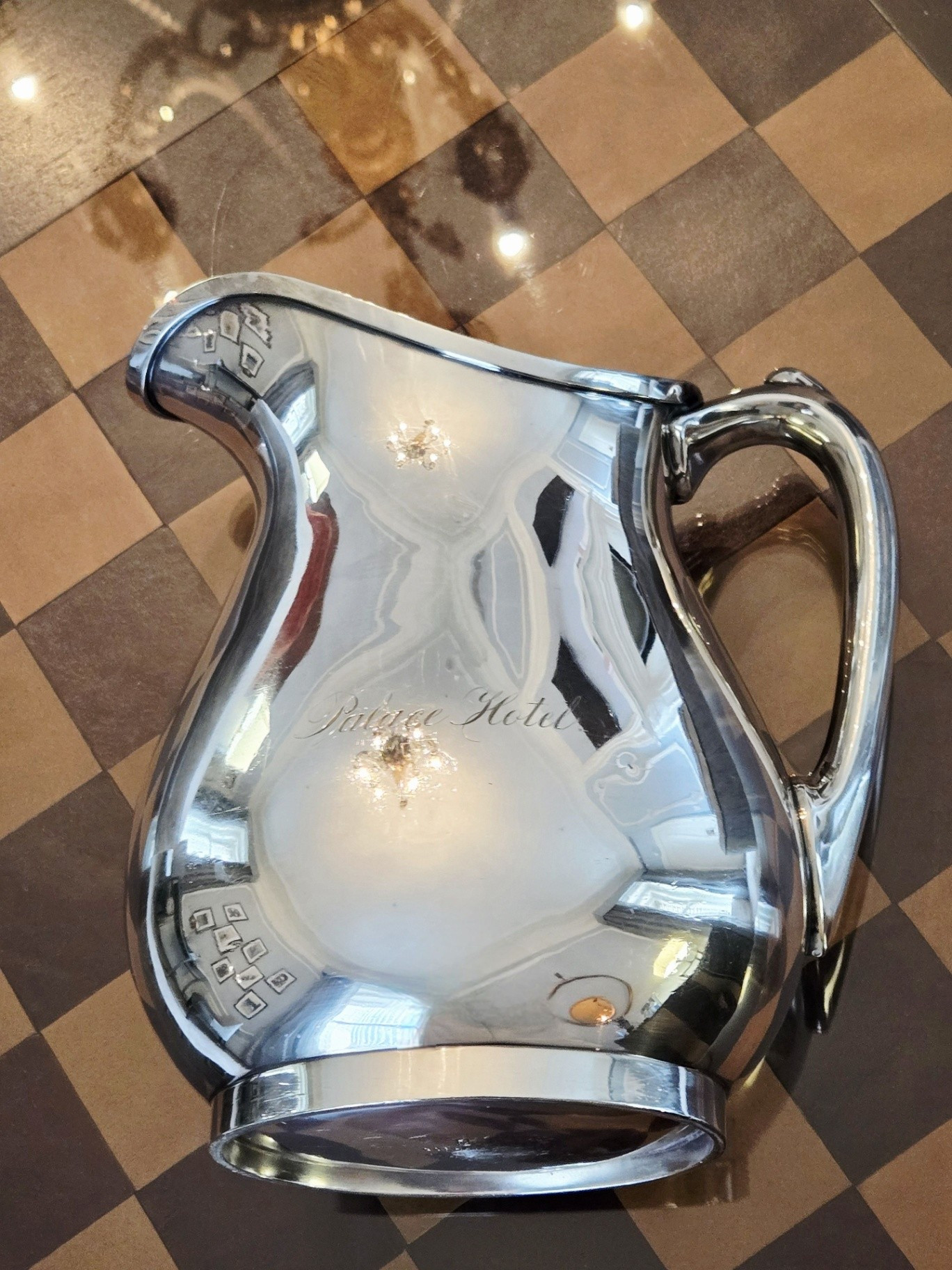 I also brought along a few of my artifacts to photograph in the suite, as well as the Garden Court. They include my 1875 Gorham water pitcher, 1875 room key, 1879 Christmas Day menu, pre-1906 luggage tag, 1930s room key, 1906 butter pat, and my butter pat & cocktail fork recovered from the Palace rubble in 1906.