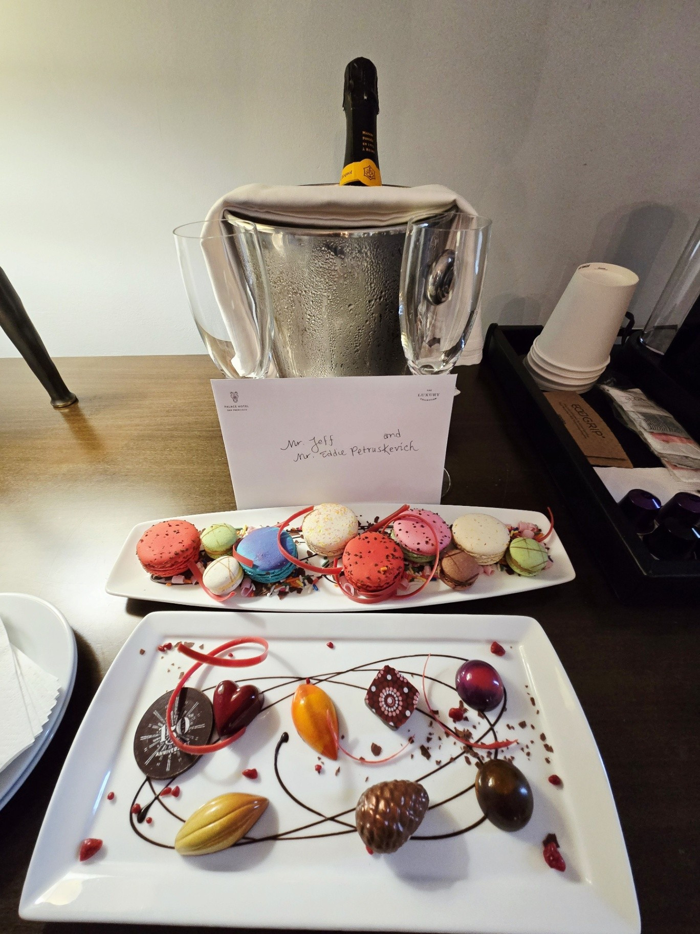 Today the Palace Hotel still welcomes discerning guests from around the world with gold standard hospitality and attention to detail. The valet and bellhop await your arrival to take care of your vehicle and luggage. As you walk up the marble staircase to the lobby doors, the doorman greets you like a family member. Upon request, a bottle of Veuve Clicquot champagne with chocolate covered strawberries will be delivered to your room after check-in. The chief concierge, Jose Lopez, bent over backwards to accommodate us during our four day stay in 2019. I have stayed at several 4 and 5 star hotels, and he was by far the most attentive and phenomenal concierge I've ever met. We were able to get a private tour of the hotel's main rooms once evening, as well as last minute tickets to see Hamilton at the Orpheum Theatre on the final night of our stay. A 2020 work conference in San Francisco with another three days reserved here was canceled due to the coronavirus. An April 2021 trip was also planned, but the hotel was still not reopened from the pandemic. We finally returned for 4 days in April 2022. To write the final chapter of my book on the hotel's history, we stayed in the Palace Suite for 5 days during Christmas 2025. This visit was also to celebrate the hotel's 150th anniversary!