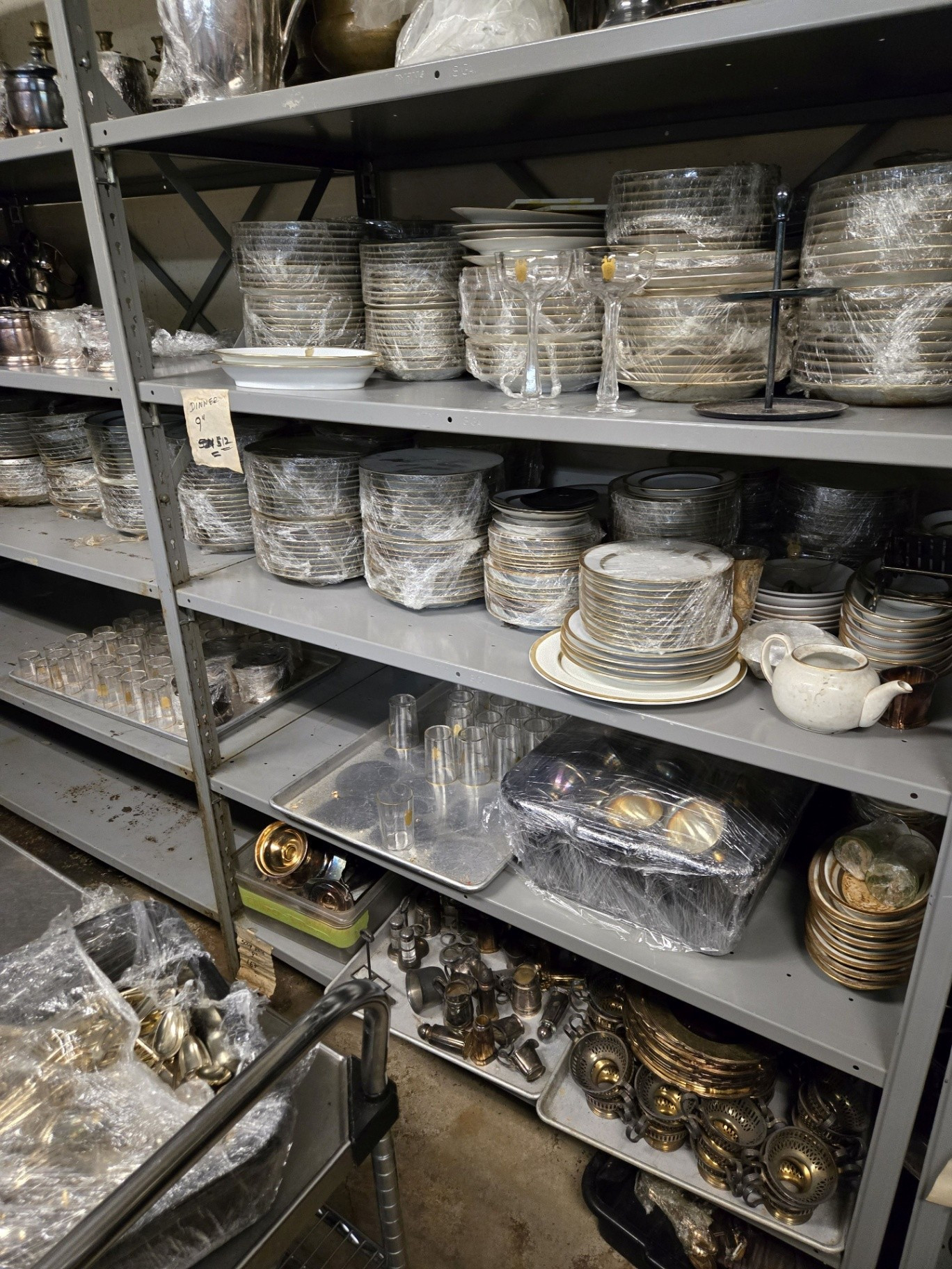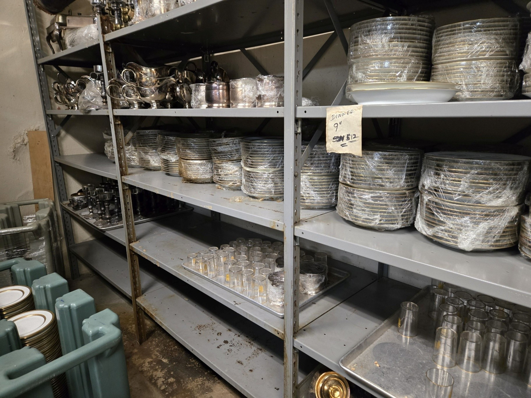 Deep within the basement, Rudy, the Head Kitchen Steward, removed a key from his pocket and unlocked a large wire cage approximately 20 by 15 feet in size. To say my jaw dropped would be an understatement. Spread across carts and shelves were thousands of pieces of Palace Hotel Gold Service from 1927, carefully stacked and wrapped in plastic. Nearby shelves held original 1909 Gorham silver serving pieces, while Gold Service glassware was stored in industrial dishwashing racks stacked nearly eight feet high. I remarked that the former manager, Clifton Clark, had once told me that very little of this service remained. Rudy simply smiled and explained that, for a full hotel service operation, this was not considered a large quantity. While it would be rare, Rudy said there are still very special occasions that this china would be used, all needing to be washed and cleaned by hand. Much of this portion of the tour now feels like a blur, as I attempted to absorb as much information as possible and examine pieces I had never seen before within a very limited window of time. I could've taken countless more photos.