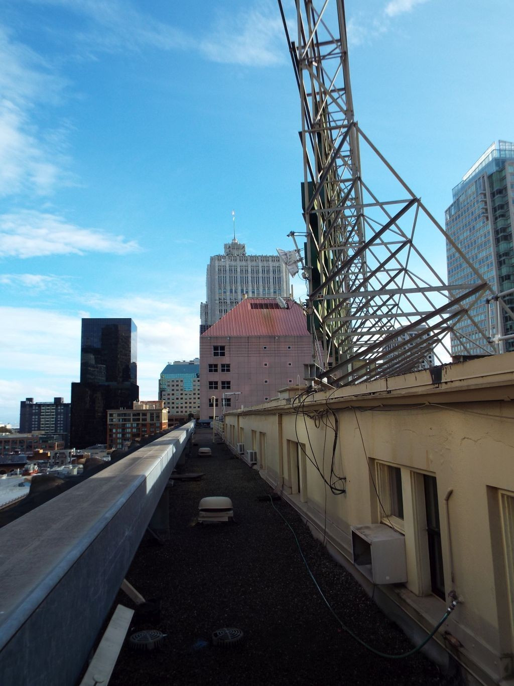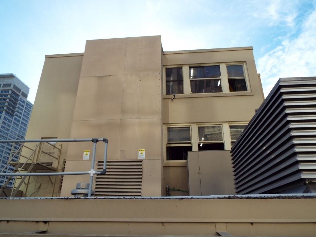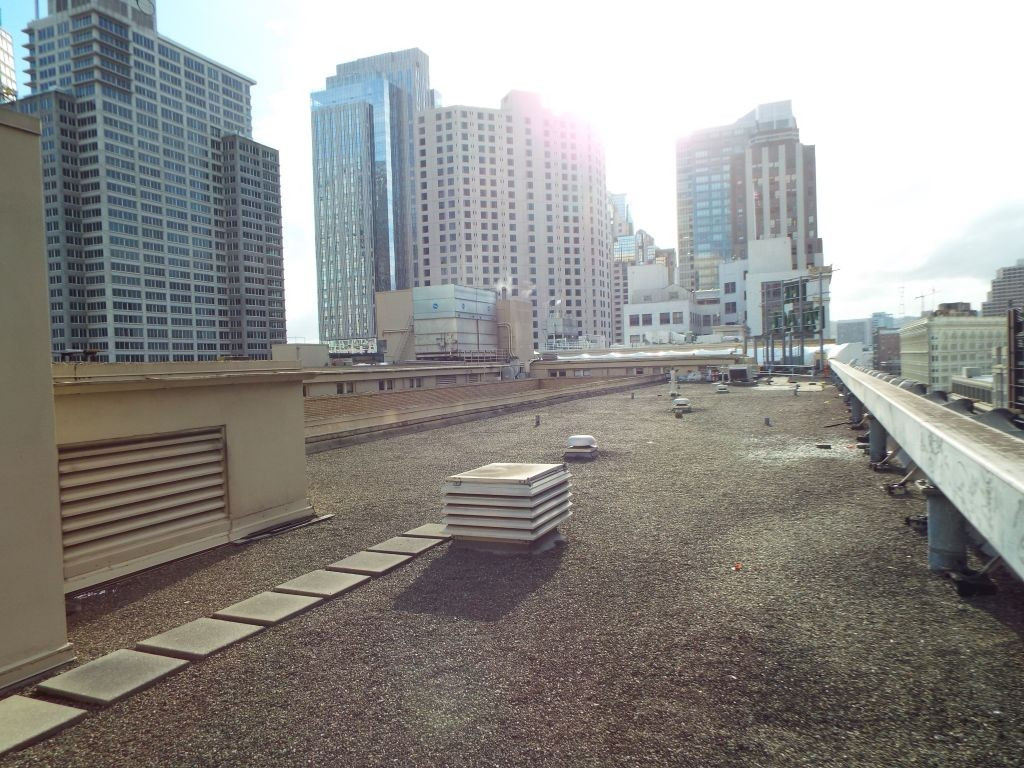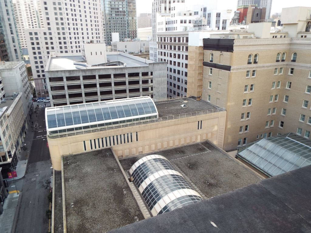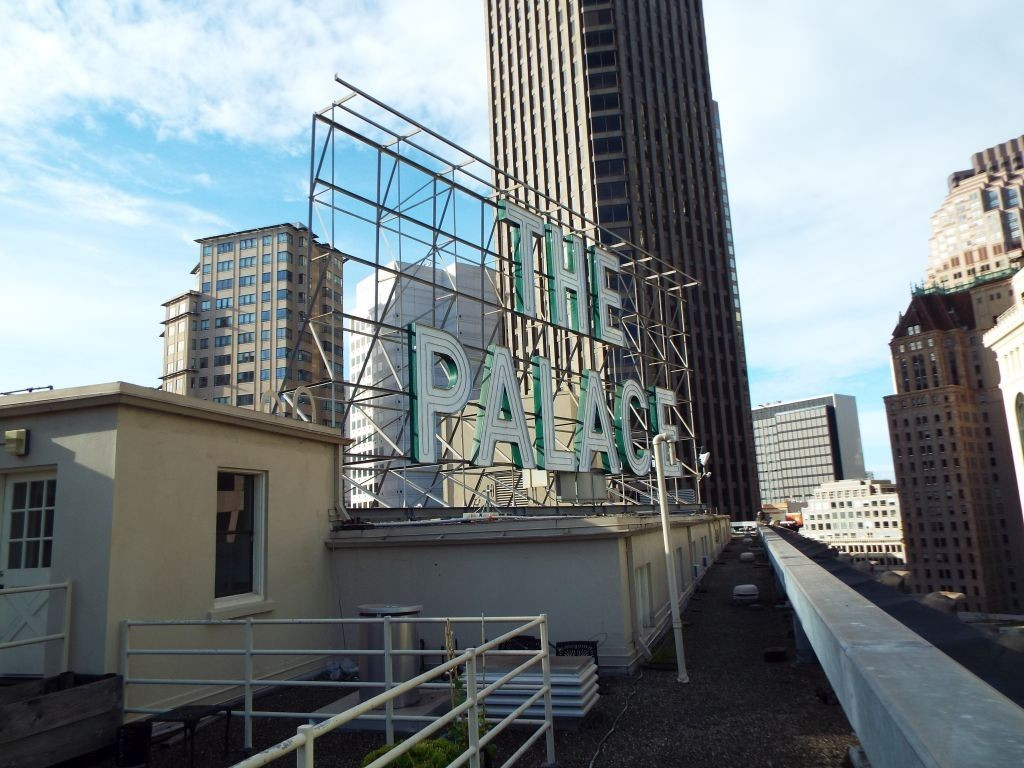 Our tour began on the hotel’s little-known ninth floor, a shortened level recessed from the outer walls and invisible from street level. This floor houses the administrative offices as well as the hotel’s archive room. From there, we first stepped out onto the roof, where I was able to photograph the Palace sign up close in its new LED lighting, the two-story structure believed to be the former KSFO radio station (1938–1942), and sweeping aerial views of the hotel’s lower sections.