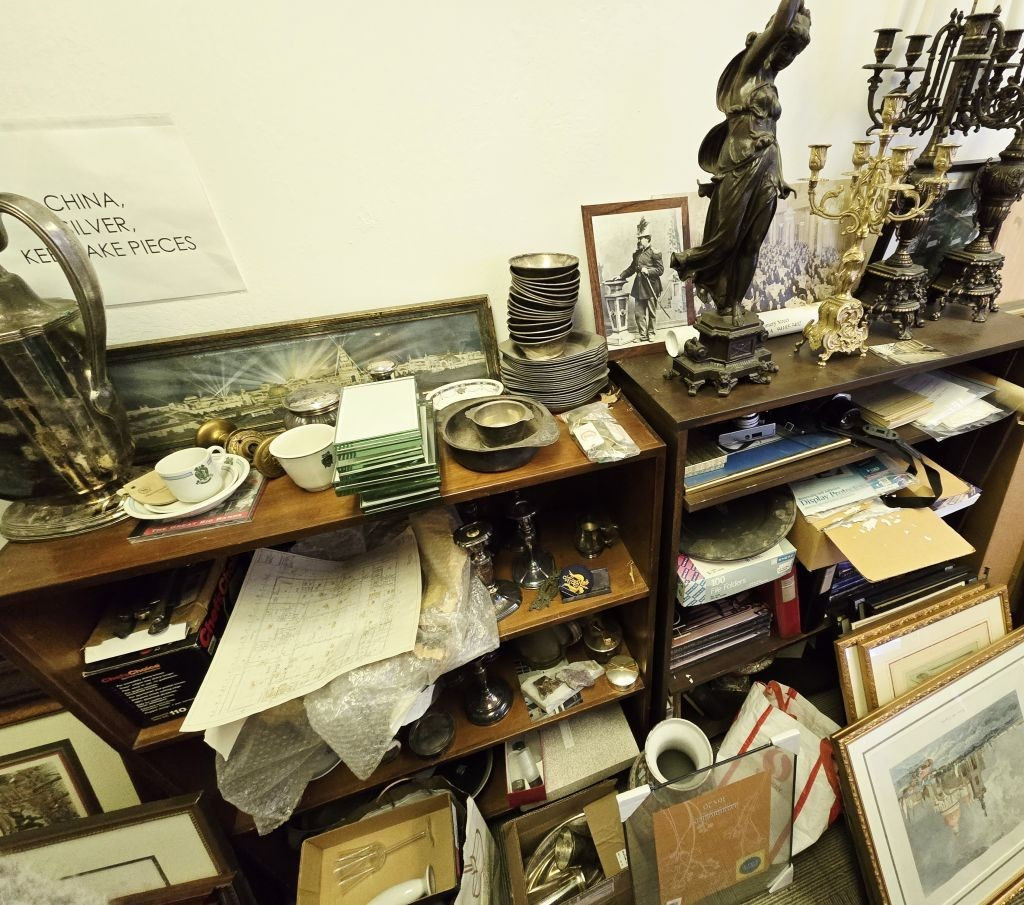 The room also features a variety of china, chandelier pieces, menus, photographs, keys, and other memorabilia spanning over 100 years.